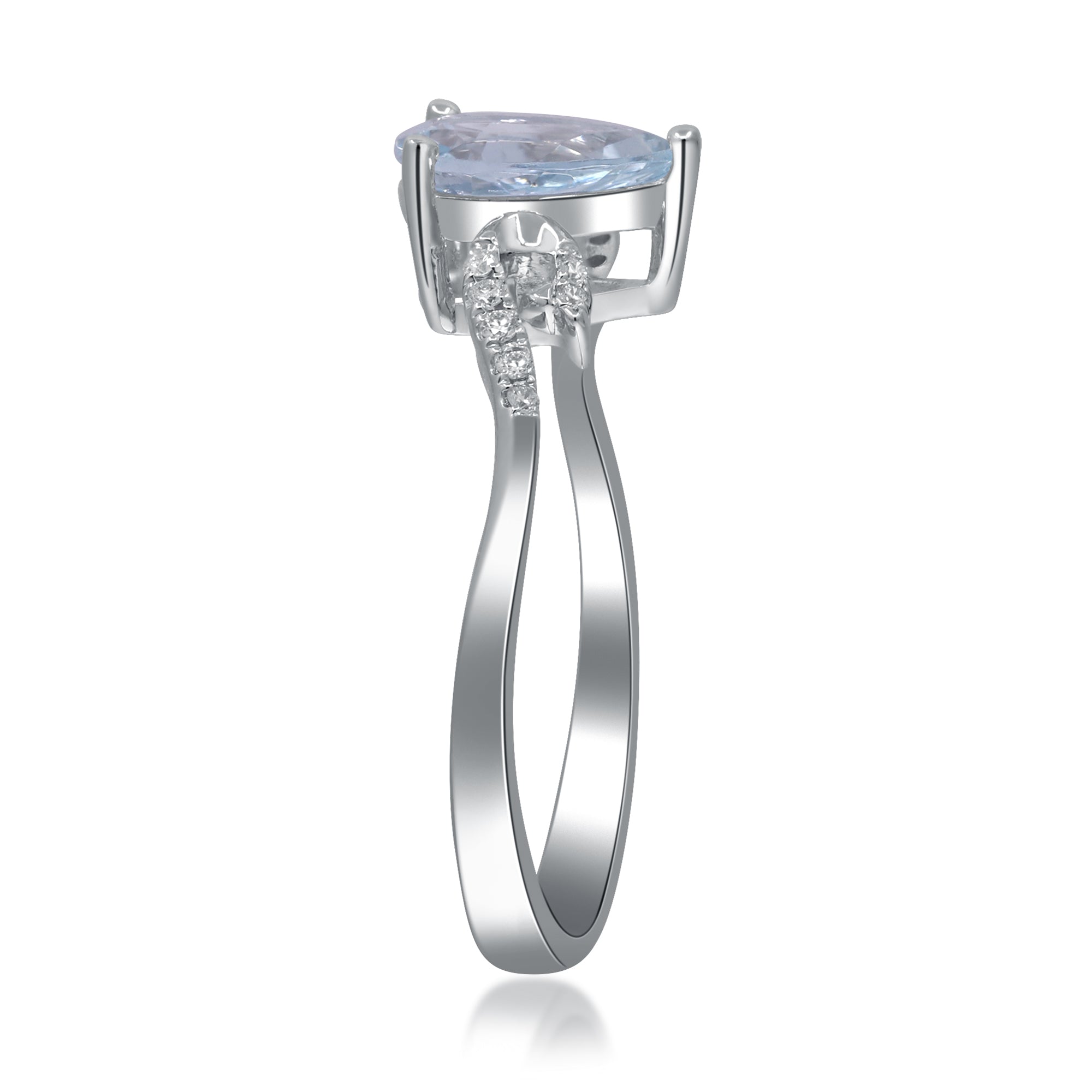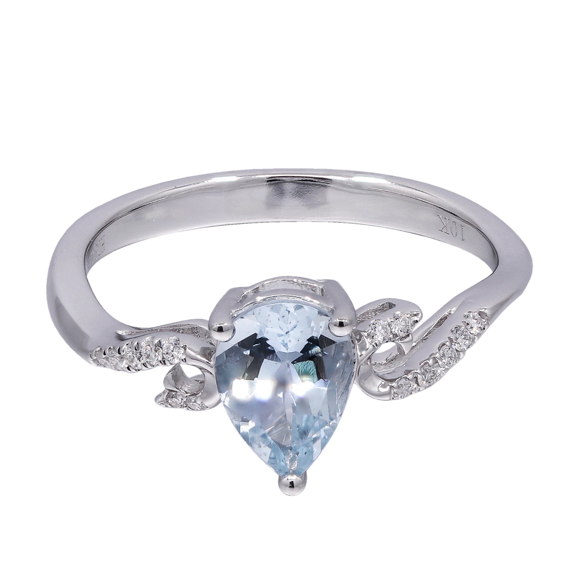 Stunning, timeless and classy eternity Unique Ring. Decorate yourself in luxury with this Gin & Grace Ring. The 10K White Gold jewelry boasts Pear-Cut Prong Setting Natural Aquamarine (1 pc) 0.88 Carat, along with Natural Round cut white Diamond (14 Pcs) 0.06 Carat, accent stones for a lovely design. This Ring is weight 2.09 grams. Crafted with 10K White Gold, this delicate Ring is polished to a high finish shine.