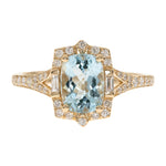 Decorate yourself in elegance with this Ring is crafted from 14K Yellow Gold by Gin & Grace. This Ring is made up of 6*8MM Cushion-Cut Brazilian Aquamarine (1 Pcs) 1.32 carat Baguette (2 Pcs) 0.04 carat and Round-cut White Diamond (36 Pcs) 0.22 carat. This Ring is weight 1.94 grams. This delicate Ring is polished to a high finish shine.