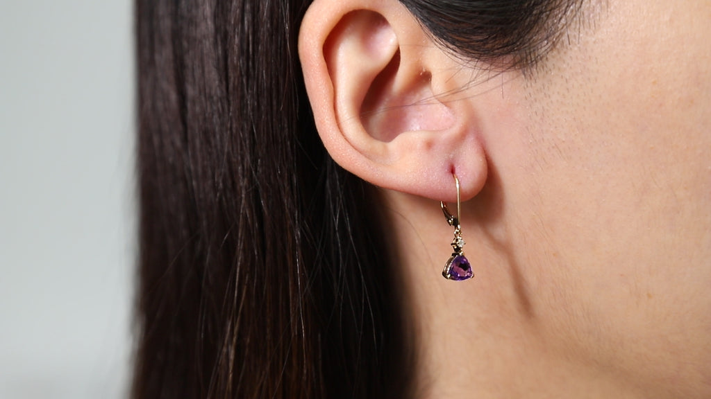 Decorate yourself in elegance with this Earring is crafted from 14K Yellow Gold by Gin & Grace Earring. The jewelry boasts 6MM Trillion-Cut prong setting Brazilian Amethyst (2 pcs) 1.34 Carat and Round-Cut prong setting Diamond (2 pcs) 0.03 Carat. This Earring is weight 1.18 grams. This delicate Earring is polished to a high finish shine. Simple leverback clasps keep these earrings securely fastened.