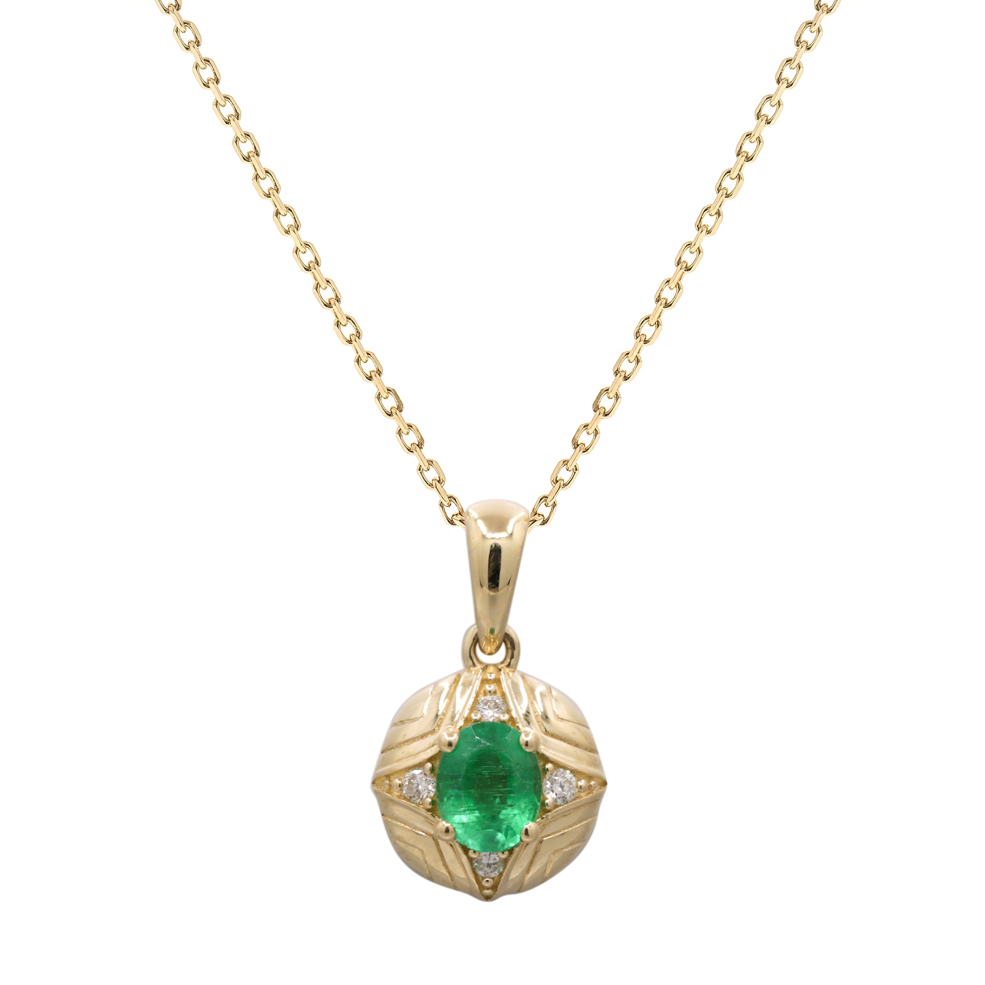 Decorate yourself in elegance with this Pendant is crafted from 14-karat Yellow Gold by Gin & Grace. This Pendant is made up of Oval-Cut Emerald (1 pcs) 0.32 carat and Round-cut White Diamond (4 Pcs) 0.04 Carat. This Pendant is weight 2.12 grams. This delicate Pendant is polished to a high finish shine.