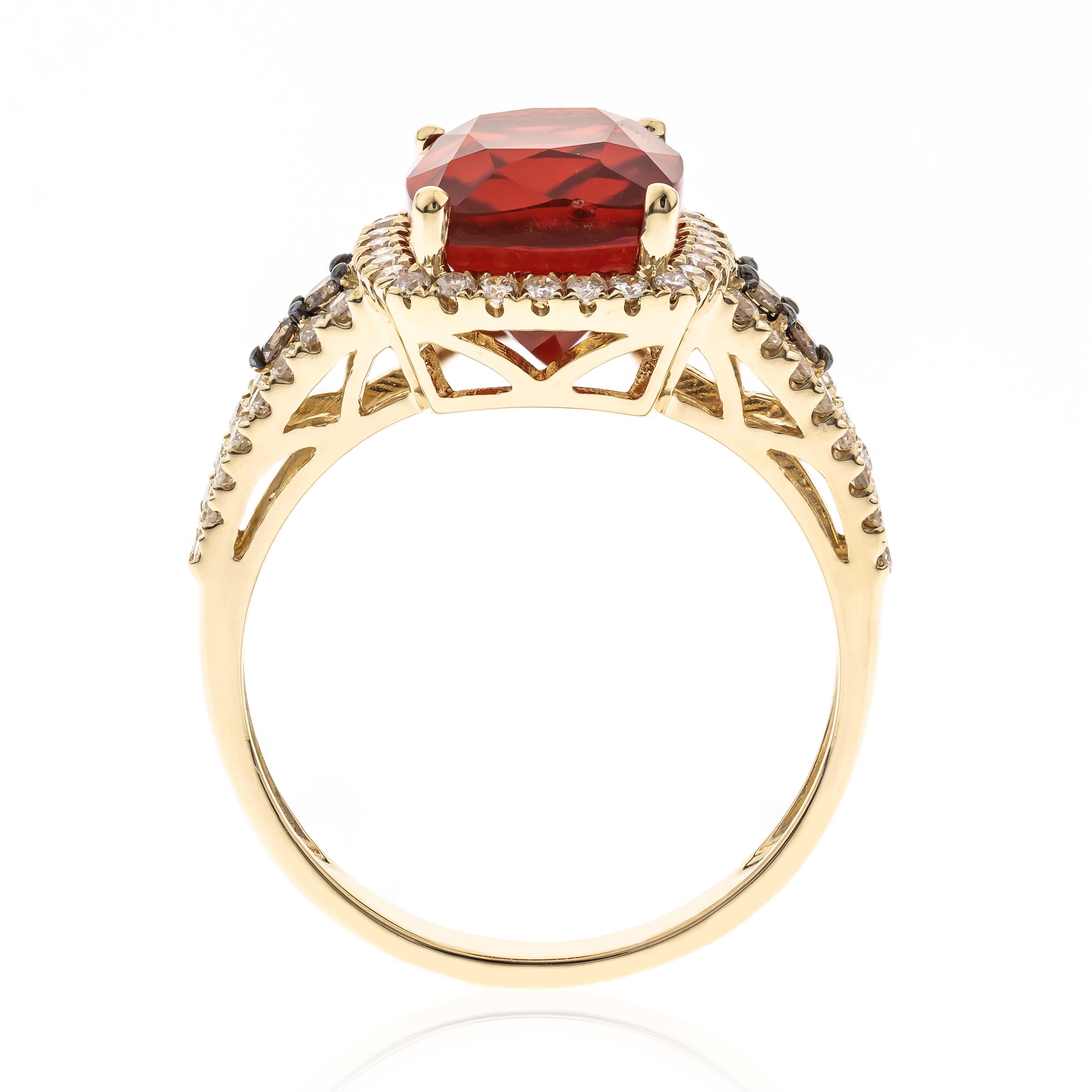 Stunning, timeless and classy eternity Unique Ring. Decorate yourself in luxury with this Gin & Grace ring. This ring is made up of Cushion-Cut Prong Setting Genuine Mexican Fire Opal (1 pcs) 1.9 Carat, Brown Diamonds(4pcs) 0.09ct and Round Diamonds (60 Pcs) 0.41 Carat accent stones for a lovely design. This ring is weight 3.2 grams. The Ring is crafted of shining 14K Yellow Gold and is completed by a highly polished finish.