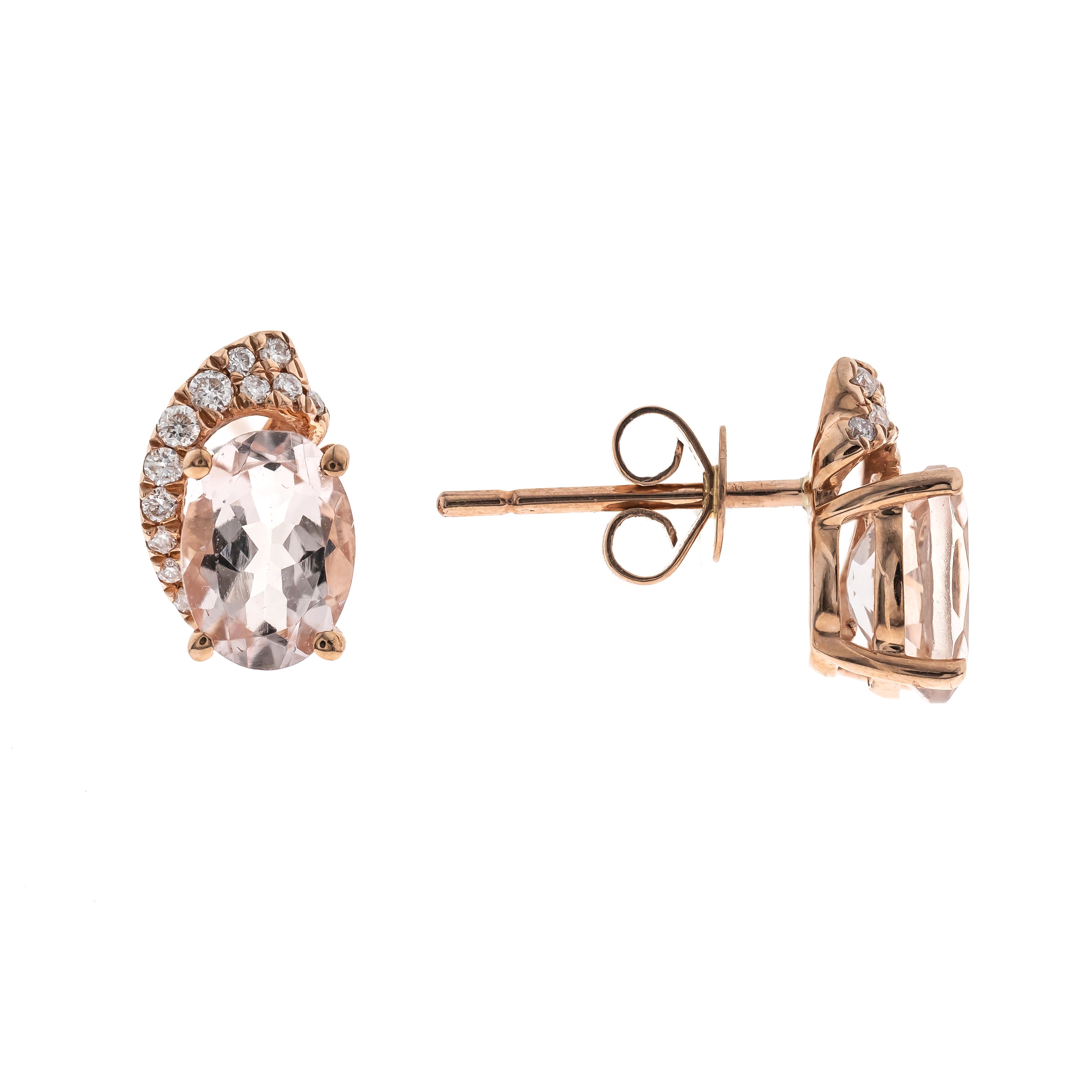 Decorate yourself in elegance with this Earring is crafted from 10K Rose Gold by Gin & Grace Earring. The jewelry boasts Oval-Cut cabochon setting white color Natural Morganite (2 pcs) 1.27 Carat and Round-Cut prong setting Diamond (24 pcs) 0.11 Carat. This Earring is weight 0.97 grams. This delicate Earring is polished to a high finish shine. Simple Stud clasps keep these earrings securely fastened.