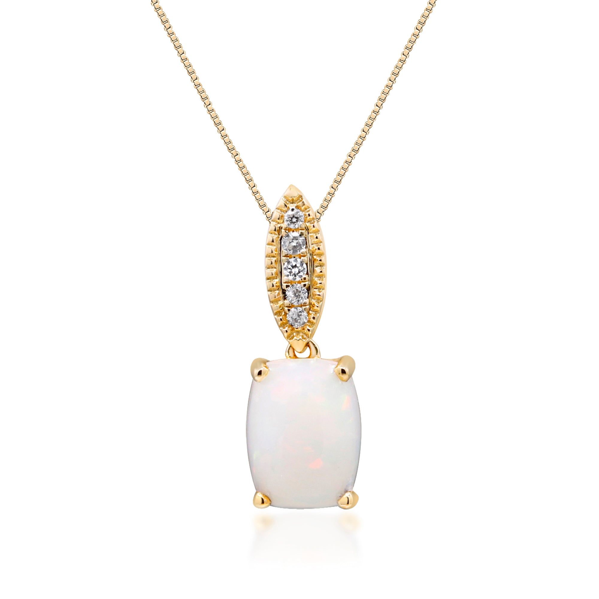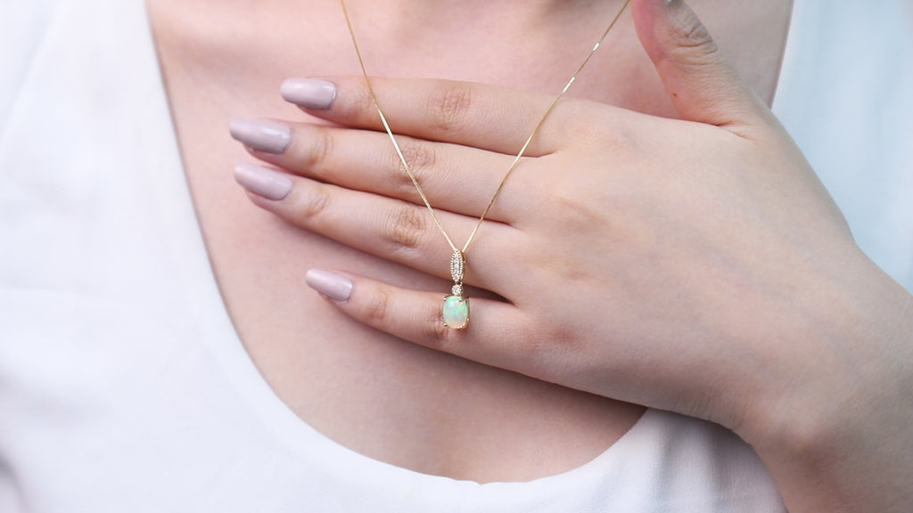Decorate yourself in elegance with this Pendant is crafted from 14-karat Yellow Gold by Gin & Grace Pendant. This Pendant is made up of 8x6 mm Oval-Cut Prong setting African Opal (1 Pcs) 0.95 Carat and Round-Cut Prong setting White Diamond (6 Pcs) 0.05 Carat. This Pendant is weight 0.75 grams. The gorgeous Pendant hangs from a 18-inch wheat chain. This delicate Pendant is polished to a high finish shine.