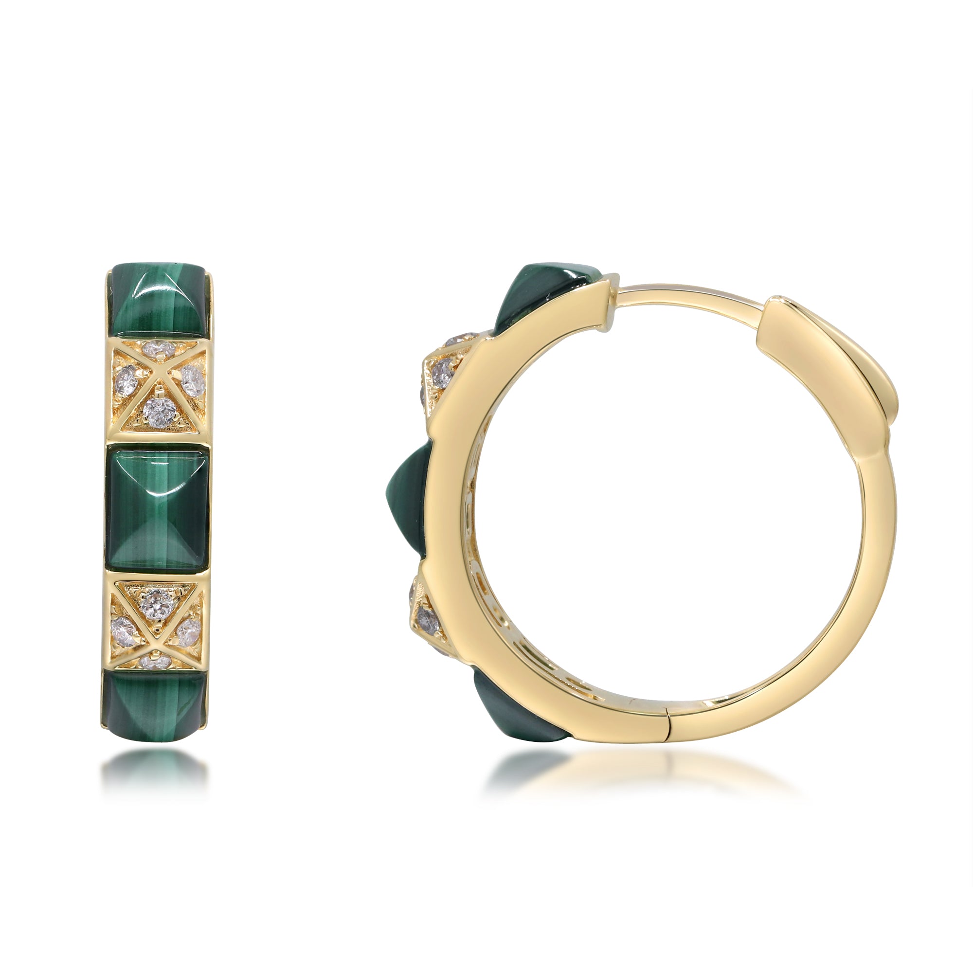 Elevate your style with these exquisite hoop earrings, masterfully crafted in 14K yellow gold. Each earring features six rich green malachite stones totaling 2.8 carats, their natural banding adding depth and character. Accentuating the design, sixteen sparkling white diamonds (0.20 carat total) are delicately set to enhance the vibrant hue of the malachite. With an artistic design and one-of-a-kind craftsmanship, this piece is a wearable work of art, perfect for those who appreciate beauty in the details.