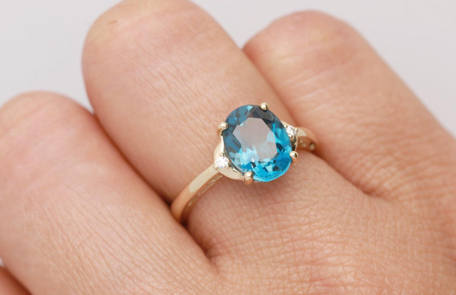 Stunning, timeless and classy eternity Engagement ring. Decorate yourself in luxury with this Gin & Grace ring. This ring is made up of Oval-Cut Prong Setting Brazilian London Blue Topaz (1 pcs) 3.24 Carat and Round-Cut Prong Setting Diamond (2 pcs) 0.03 Carat accent stones for a lovely design. This ring is weight 1.91 grams. The ring is crafted of shining 10-karat Yellow Gold and is completed by a highly polished finish.