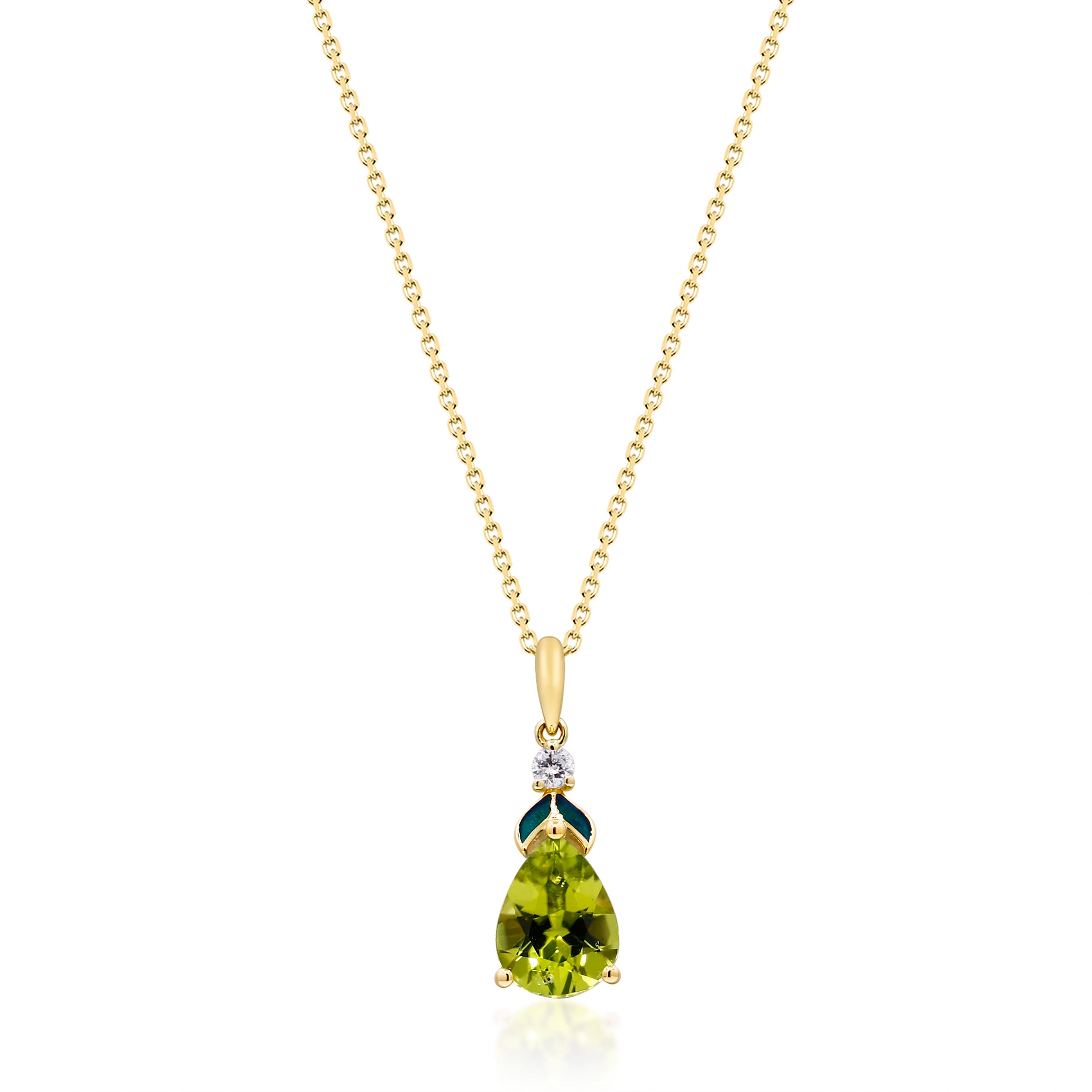 Decorate yourself in elegance with this Pendant is crafted from 10-karat Yellow Gold by Gin & Grace. This Pendant is made up of 9x7 mm Pear-Cut Manchurian Peridot (1 pcs) 1.75 carat and Round-cut White Diamond (1 Pcs) 0.07 Carat. This Pendant is weight 1.95 grams. This delicate Pendant is polished to a high finish shine.