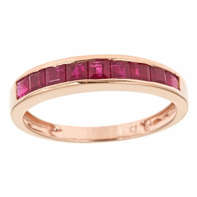 This ring features seven square-cut Thai rubies in a row in channel settings. The ring is crafted of 14-karat rose gold with a highly polished finish. Gemstone colors: Pink Gemstone shapes: Square Nine Channel-setting square-cut Thai rubies each measure 3 mm wide x 3 mm long Total gemstone weight: 0.91 carats Metal: 14k rose gold Finish: High polish Metal weight: 1.88 grams Ring setting dimensions: 19 mm wide x 3 mm long Band dimensions: 2 mm wide