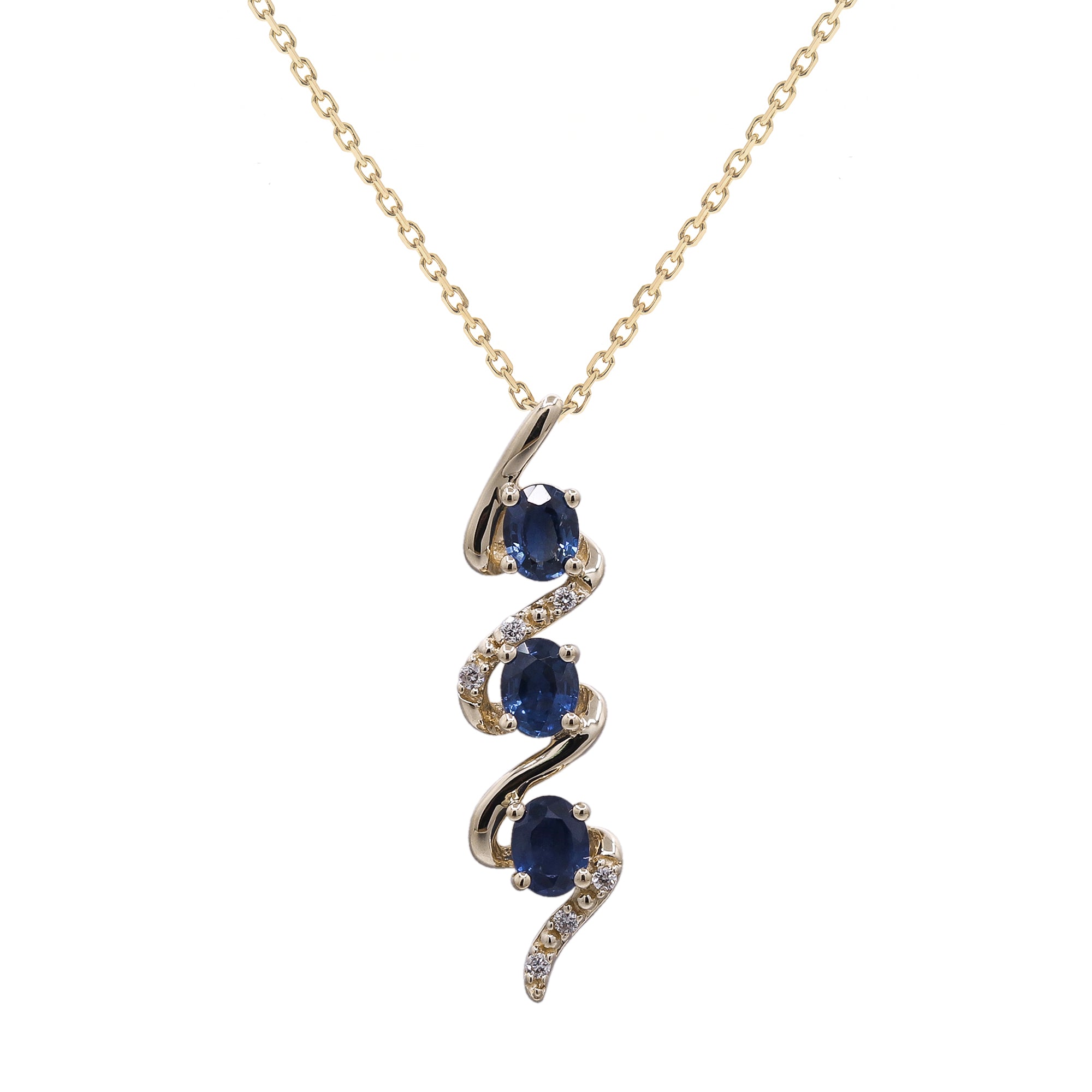 Decorate yourself in elegance with this Pendant crafted from 14K Yellow Gold by Gin & Grace. This Pendant is made up of Ceylon Blue Sapphire Oval-cut (3 pcs) 0.66 and Round-cut White Diamond (8 Pcs) 0.05 Carat. This Pendant weigh 1.95 grams. This delicate Pendant is polished to a high finish shine.