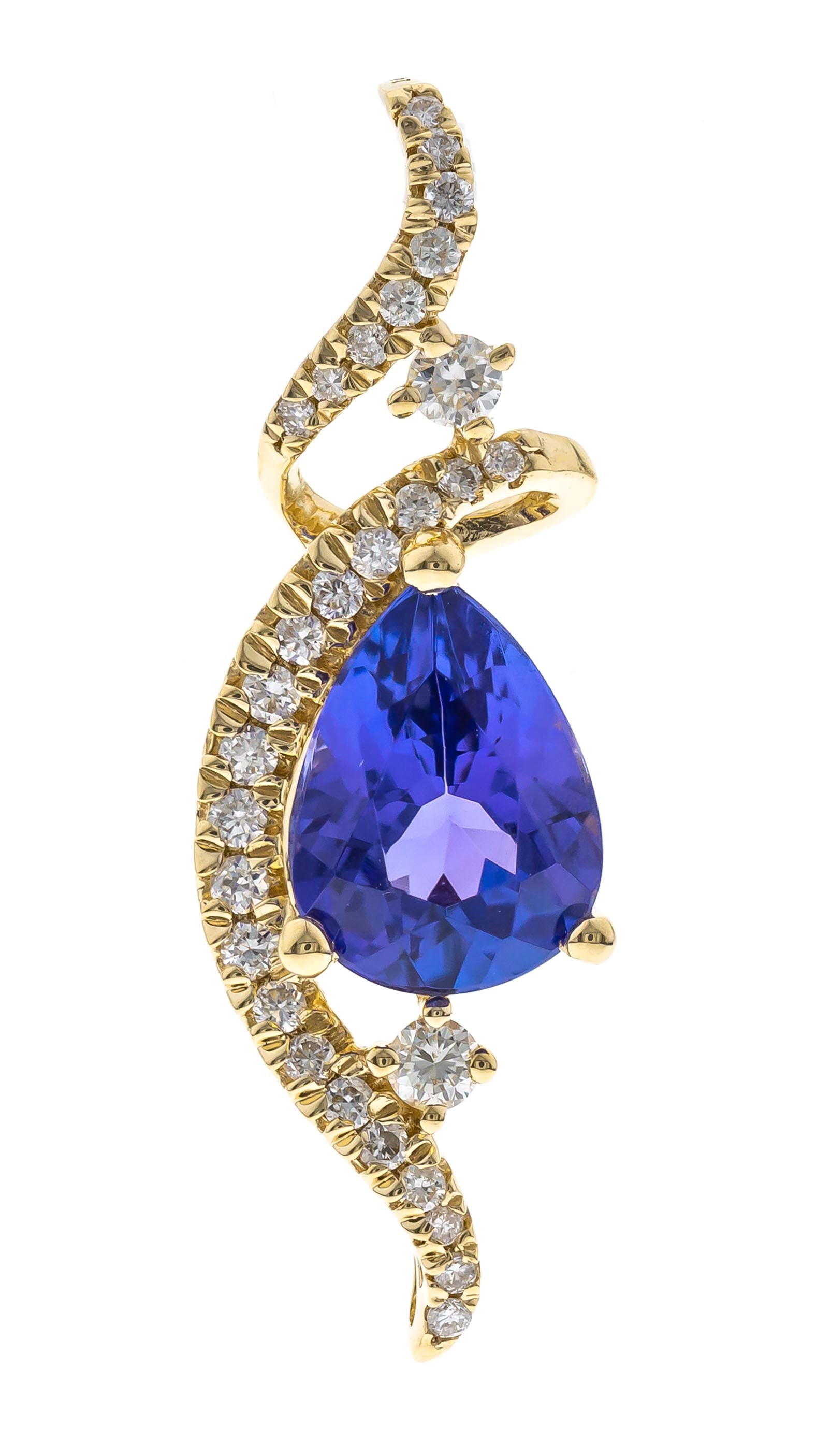 Decorate yourself in elegance with this Pendant is crafted from 14K Yellow Gold by Gin & Grace Pendant. This Pendant is made up of Pear-Cut Prong setting Natural Tanzanite (1 Pcs) 1.03 Carat and Round-Cut Prong setting Natural White Diamond (29 Pcs) 0.15 Carat. This Pendant is weight 1.09 grams. The gorgeous Pendant hangs from an 18-inches chain. This delicate Pendant is polished to a high finish shine.