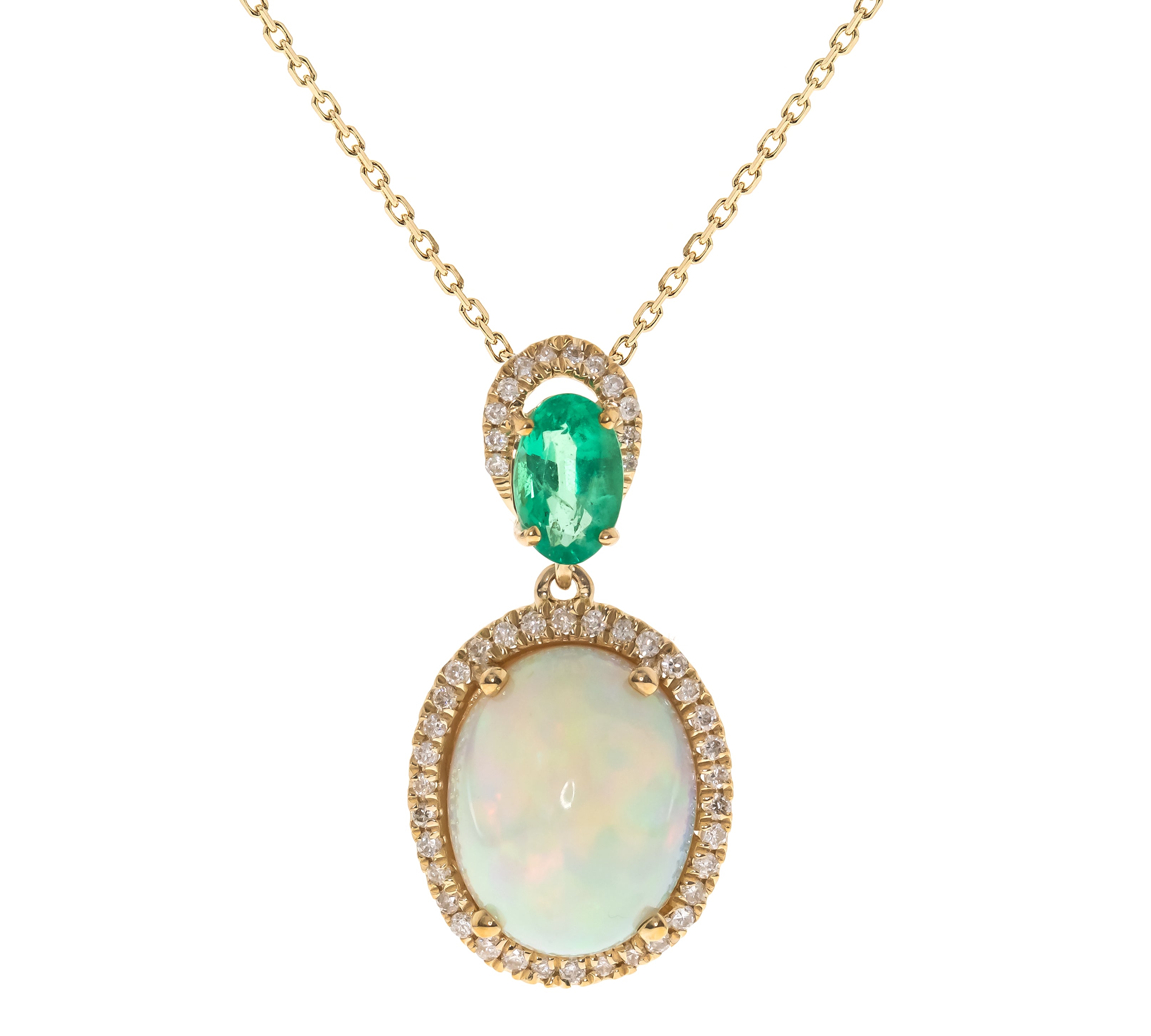 Classic Ethiopian Opal & Emerald Double Halo Pendant Necklace
