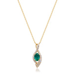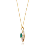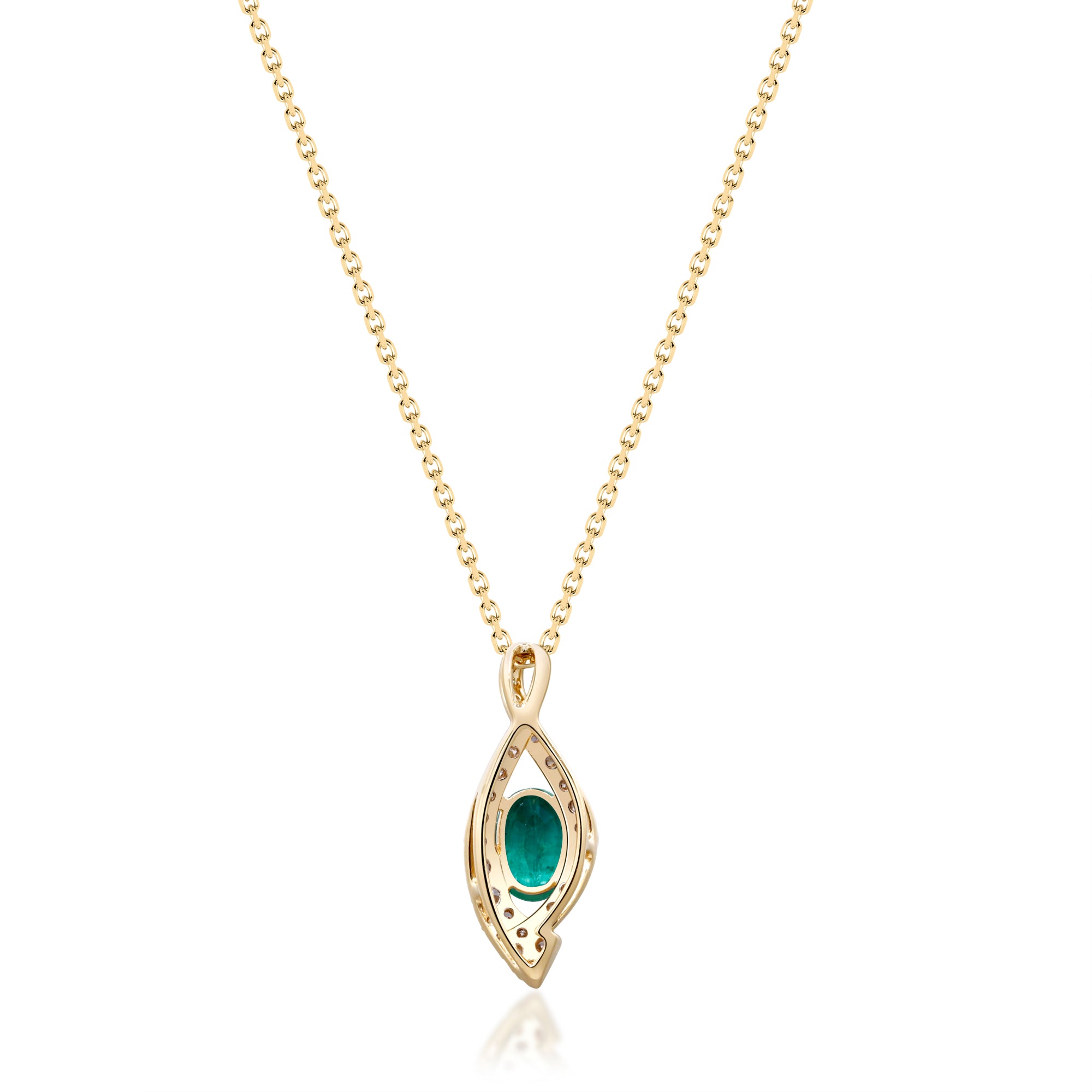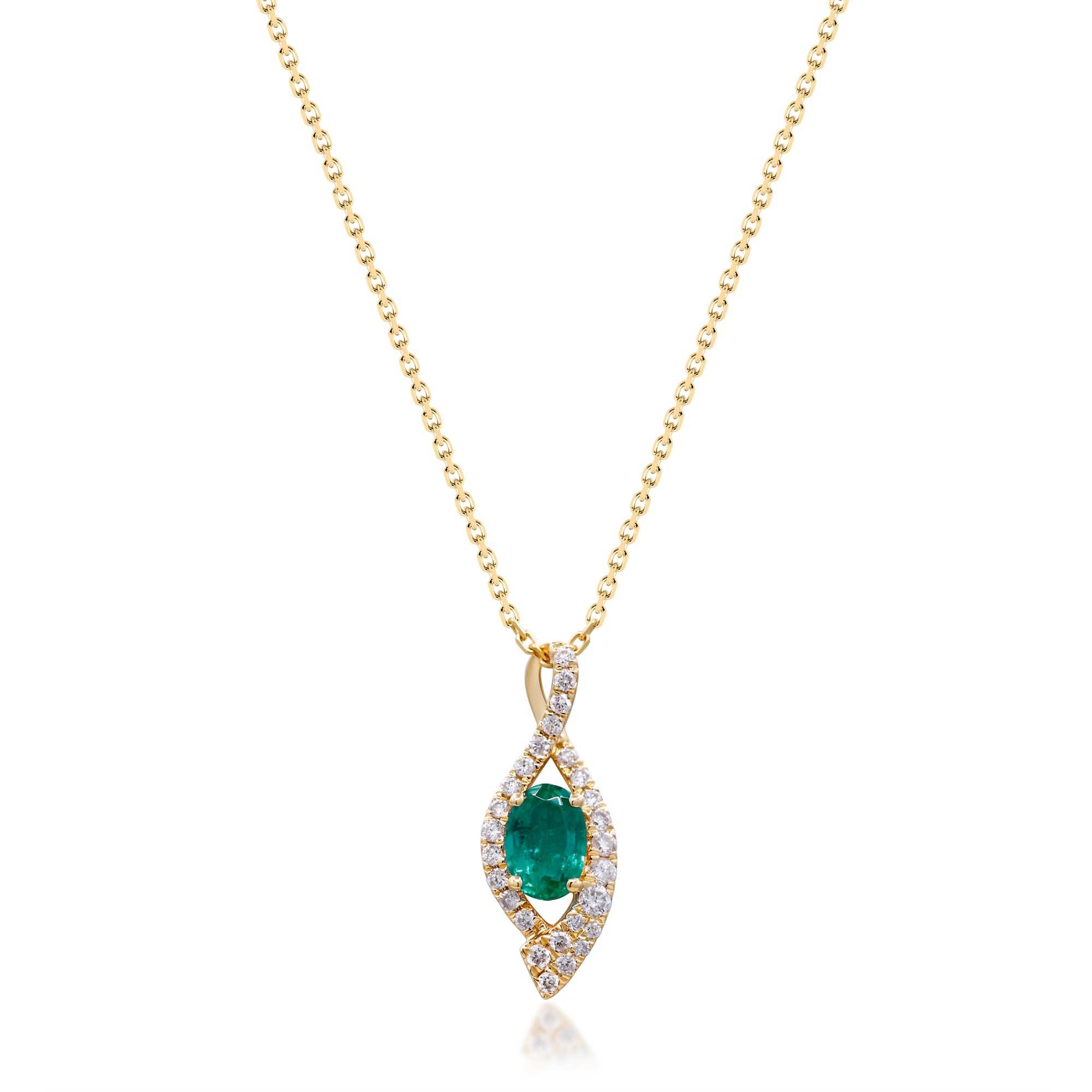 Decorate yourself in elegance with this Pendant is crafted from 10-karat Yellow Gold by Gin & Grace. This Pendant is made up of Oval-Cut Emerald (1 pcs) 0.42 carat and Round-cut White Diamond (27 Pcs) 0.21 Carat. This Pendant is weight 0.56 grams. This delicate Pendant is polished to a high finish shine.
