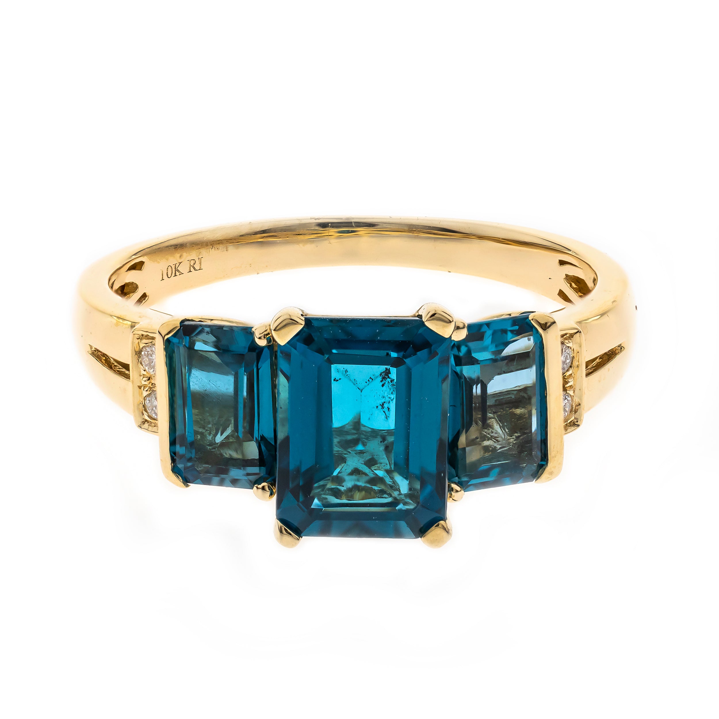 Stunning, timeless and classy eternity Unique Ring. Decorate yourself in luxury with this Gin & Grace Ring. The 10k Yellow Gold jewelry boasts Emerald-Cut Basel Setting Genuine Brazilian London Blue Topaz (3 pc) 3.65 Carat, along with Natural Round Cut white Diamond (4 Pcs) 0.02 Carat, accent stones for a lovely design. This Ring is weight 2.15 grams. Crafted with 10k Yellow Gold, this delicate Ring is polished to a high finish shine.
