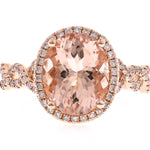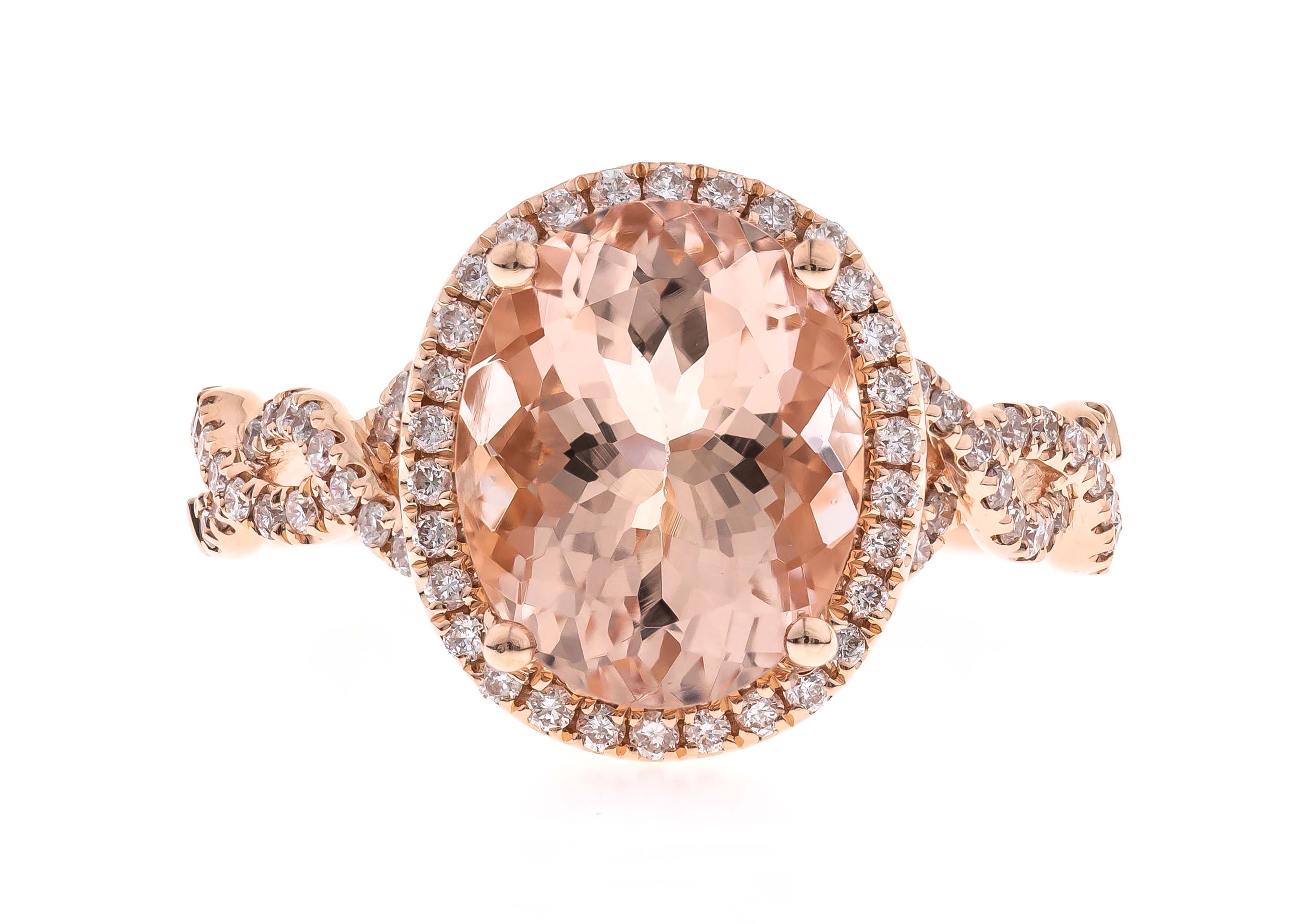 Decorate yourself in elegance with this Ring crafted from 14-karat Rose Gold by Gin & Grace. This Ring is made up of 9*11 mm Oval-cut (1pcs) 3.37 carat Madagascar Morganite and Round Cut Diamond (72 Pcs) 0.36 Carat. This Ring weighs 3.92 grams. This delicate Ring is polished to a high finish shine.