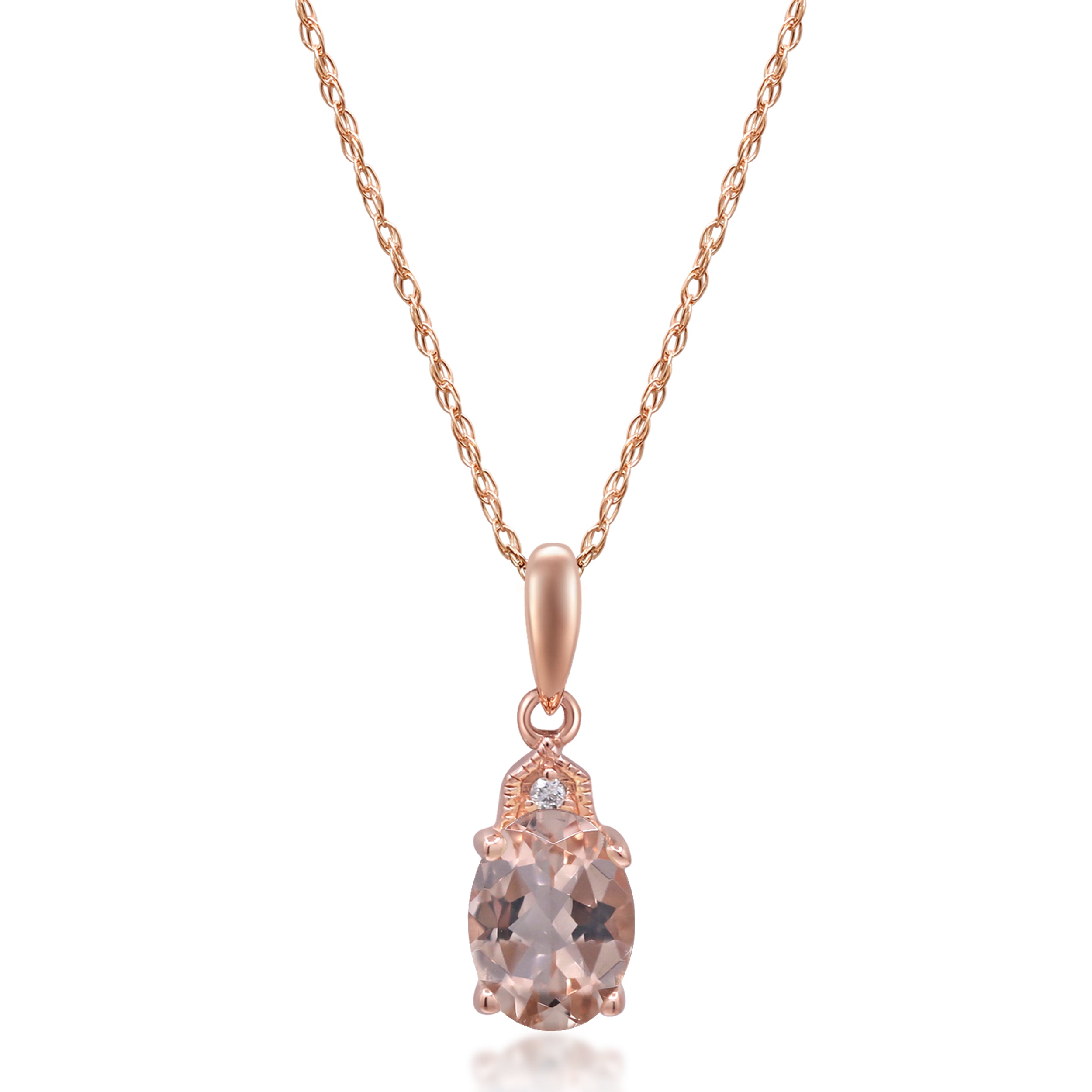 Decorate yourself in elegance with this Pendant is crafted from 10-karat Rose Gold by Gin & Grace Pendant. This Pendant is made up of Oval-cut Prong setting Morganite (1 Pcs) 0.73 Carat and Round-Cut White Diamond (1 Pcs) 0.01 Carat. This Pendant is weight 0.43 grams. The gorgeous Pendant hangs from an 18-inch wheat chain. This delicate Pendant is polished to a high finish shine.