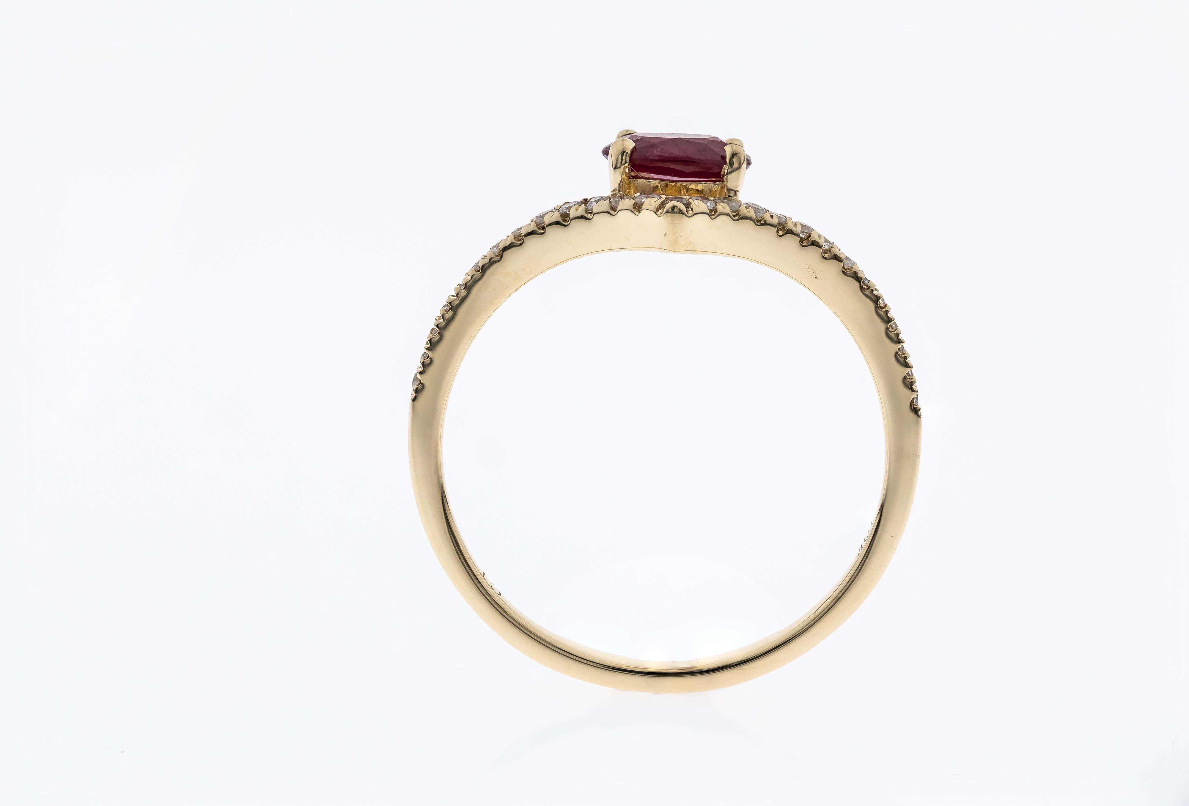 Stunning, timeless and classy eternity Unique ring. Decorate yourself in luxury with this Gin & Grace ring. This ring is made up of Oval-Cut Prong Setting Genuine Mozambique Ruby (1 pcs) 0.56 Carat and Round-Cut Prong Setting Diamond (27 pcs) 0.11 Carat accent stones for a lovely design. This ring is weight 1.35 grams. The ring is crafted of shining 10-karat Yellow Gold and is completed by a highly polished finish.Â