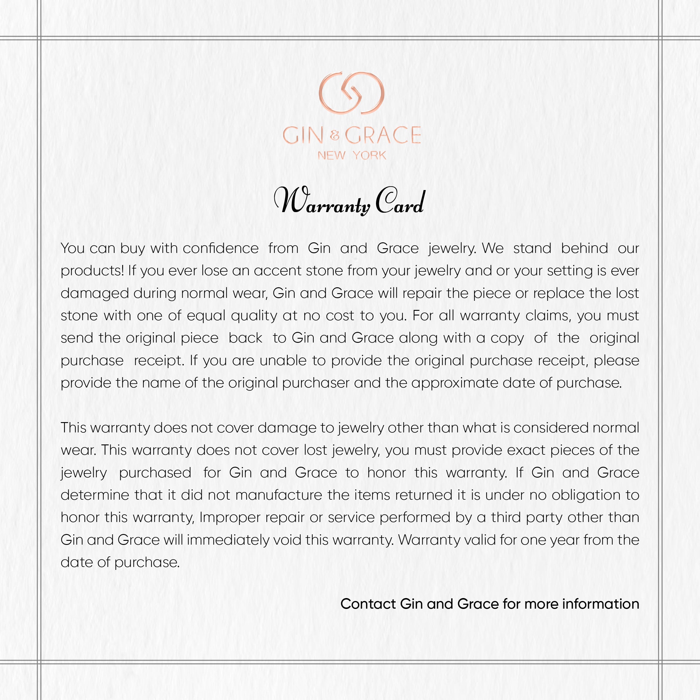 Gin & Grace offers insured FedEx, USPS and UPS shipping on all orders within the U.S. Shipments to Alaska, Hawaii, U.S. territories, and APF/FPO/DPO addresses take additional time. Gin & Grace is not responsible for delays caused by weather, the actions of the shipping company, or circumstances beyond our control.
