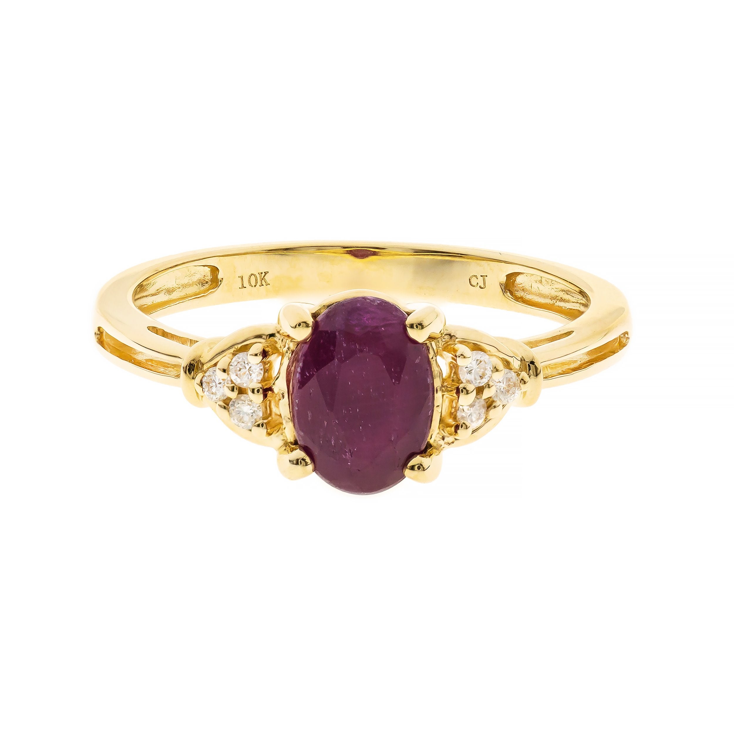 Decorate yourself in elegance with this Ring is crafted from 10-karat Yellow Gold by Gin & Grace. This Ring is made up of oval-cut Ruby (1 pcs) 1.39 carat Ruby and Round Cut Diamond (6 Pcs) 0.06 Carat. This Ring is weight 1.90 grams. This delicate Ring is polished to a high finish shine.