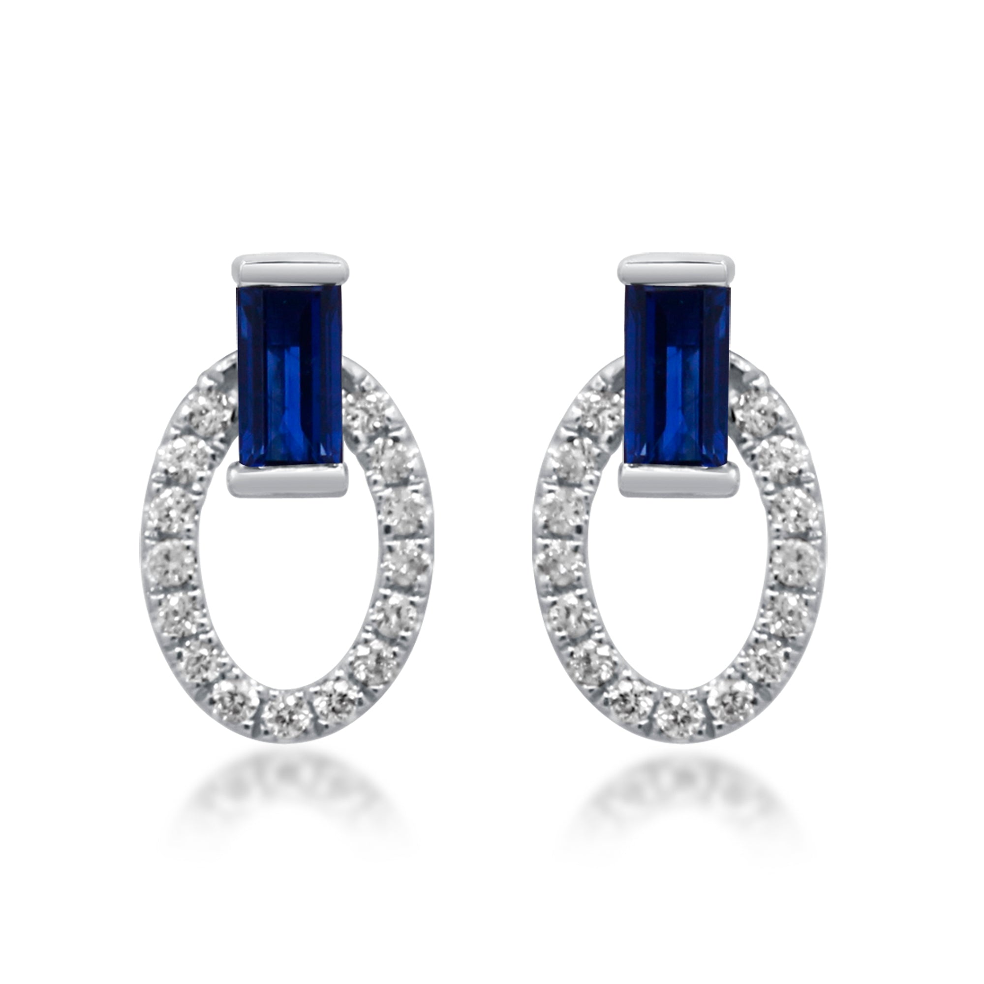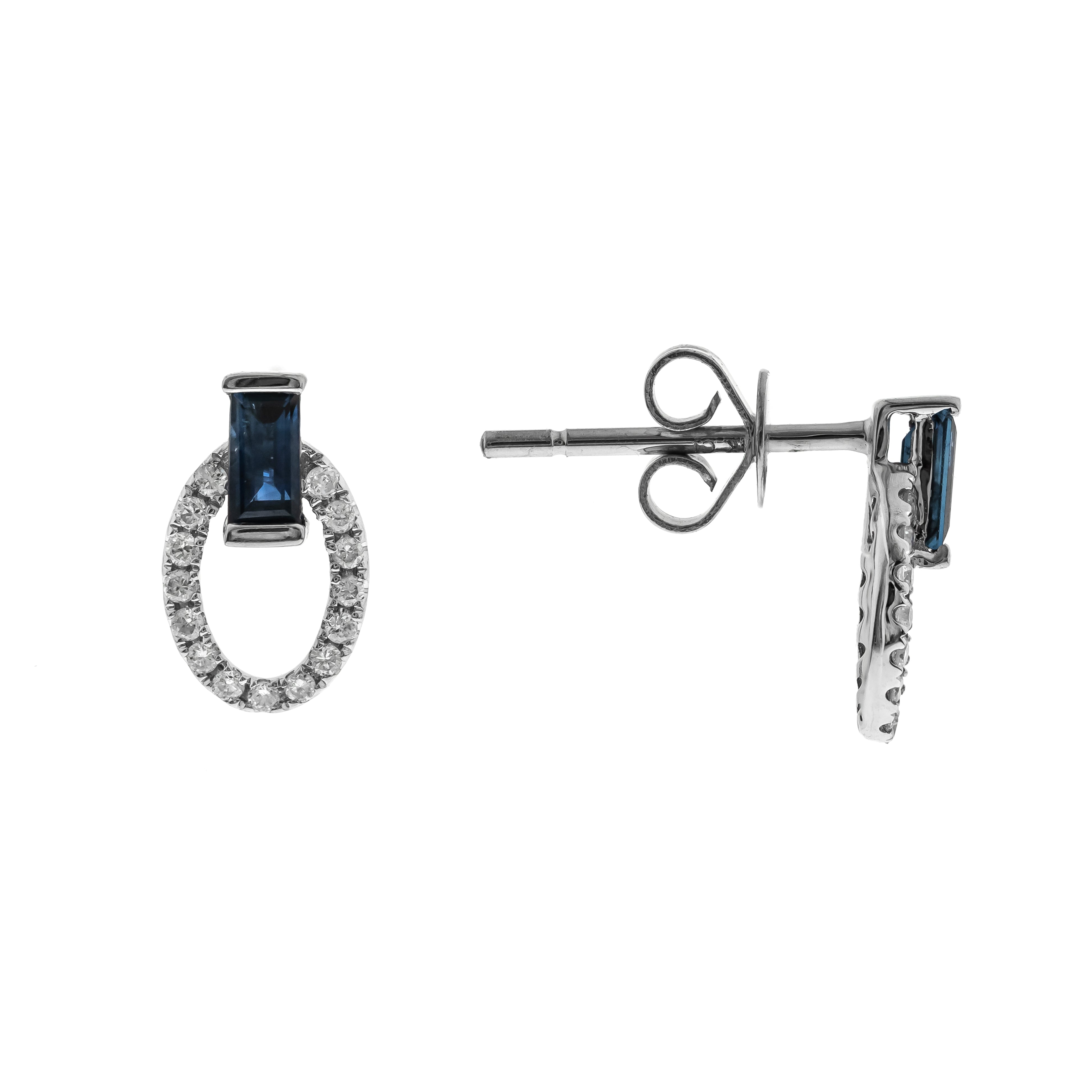 Stunning, timeless and classy eternity Unique Earrings. Decorate yourself in luxury with this Gin & Grace Earrings. This Earrings is made up of Baguette-Cut Prong Setting Genuine Blue Sapphire (2 pc) 0.28 Carat and Round-Cut Prong Setting Natural Diamond (30 pcs) 0.12 Carat accent stones for a lovely design. This Earrings is weight 0.99 grams. The Earrings is crafted of shining 14K White Gold and is completed by a highly polished finish.