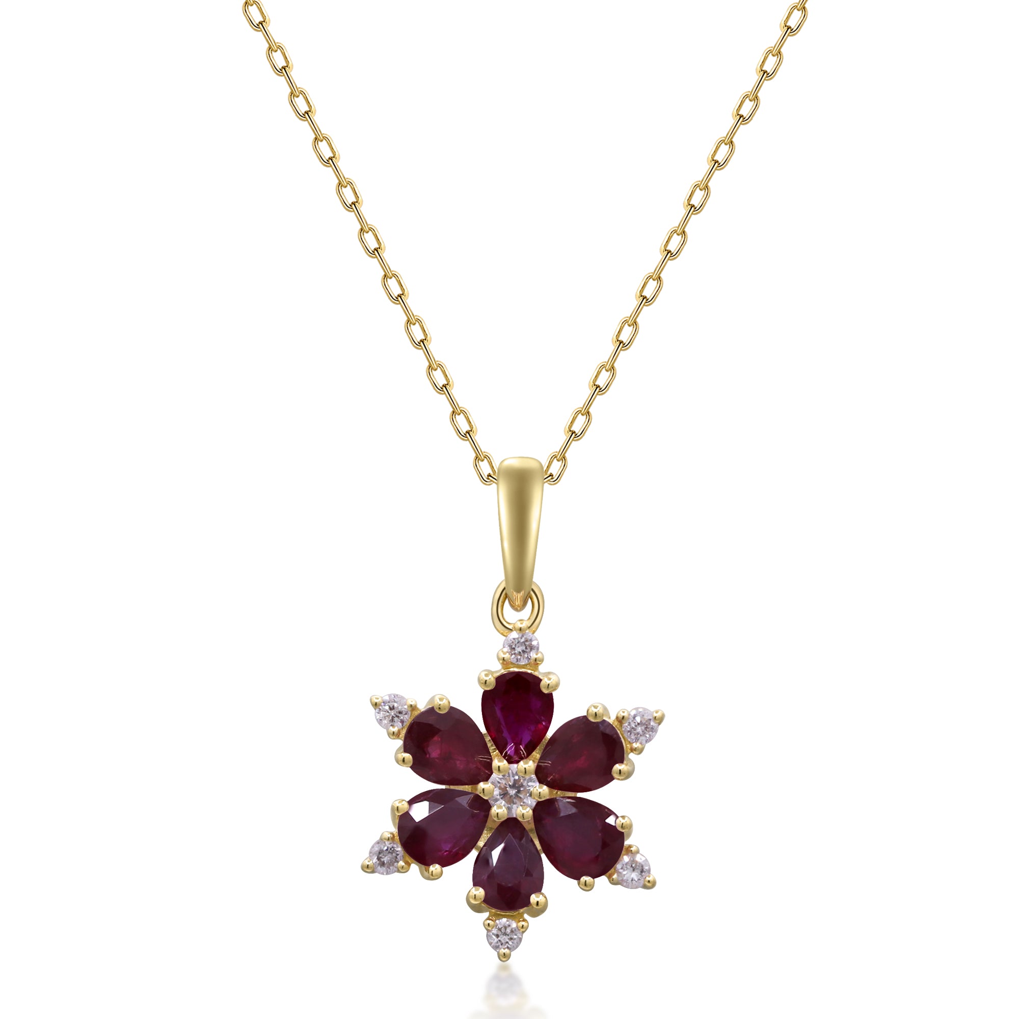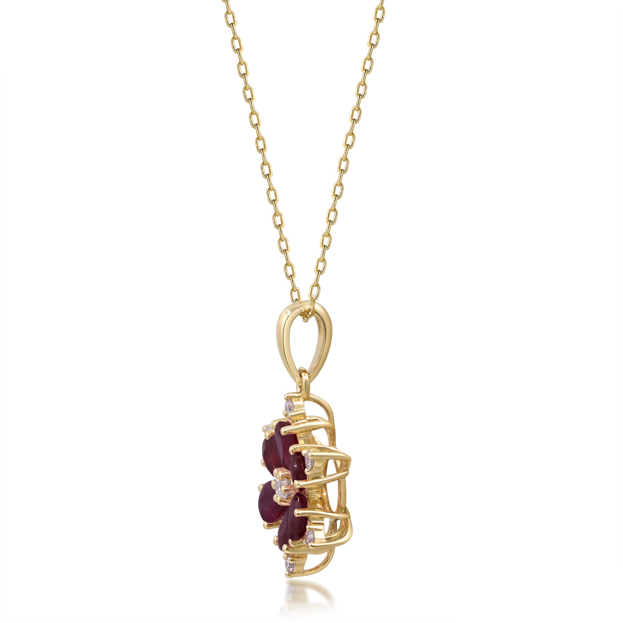 Stunning, timeless and classy eternity Unique Pendant. Decorate yourself in luxury with this Gin & Grace Pendant. This Pendant is made up of Pear-Cut Prong Setting Genuine Mozambique Ruby (6 pc) 0.87 Carat and Round-Cut Prong Setting Natural Diamond (9 pcs) 0.12 Carat accent stones for a lovely design. This pendant is weight 2.01 grams. The pendant is crafted of shining 14-karat Yellow Gold and is completed by a highly polished finish.