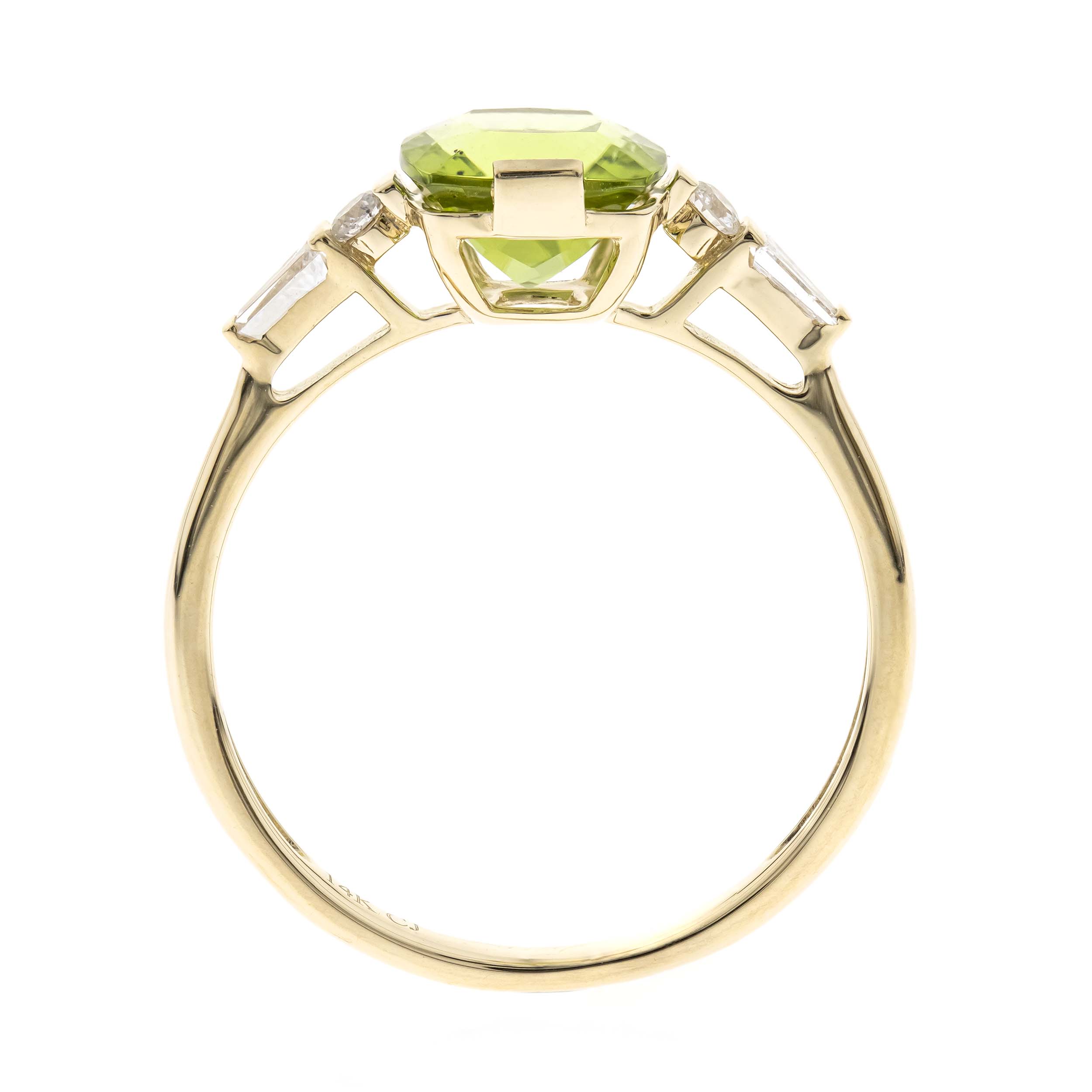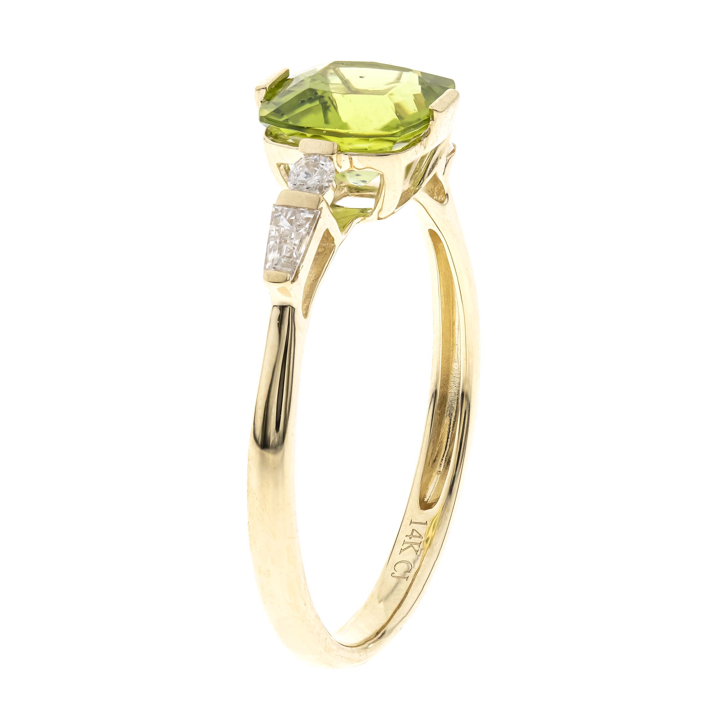 Decorate yourself in elegance with this Ring is crafted from 14-karat Yellow Gold by Gin & Grace. This Ring is made up of 7.0 mm Cushion-Cut Manchurian Peridot (1 pcs) 1.56 carat and Round-cut White Diamond (2 Pcs) 0.05 Carat, Baguette-cut White Diamond ( 2 pcs) 0.09 carat. This Ring is weight 1.56 grams. This delicate Ring is polished to a high finish shine.