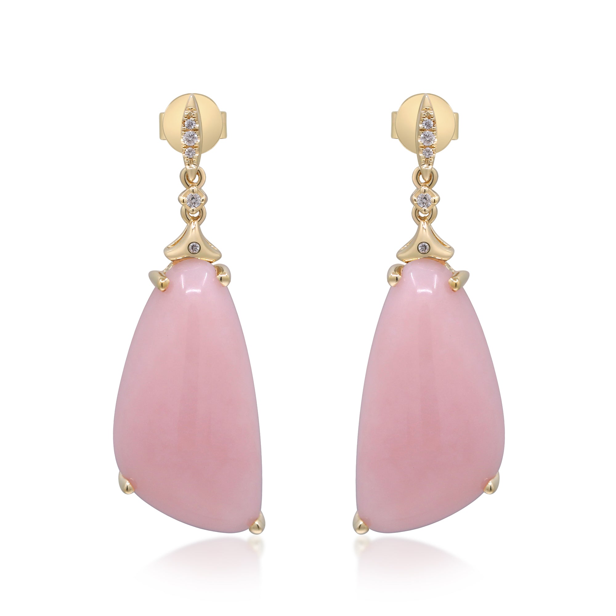Adorn your ears with our exquisite pink opal earrings, featuring a total weight of 18.70 carats. Each earring showcases a stunning pink opal, celebrated for its soft, delicate hues and unique texture. Enhanced by 10 shimmering round diamonds, these earrings offer a brilliant contrast that elevates their elegance. Perfect for both casual outings and formal events, these earrings are a timeless addition to any jewelry collection. Embrace the beauty of pink opal and let these earrings be a captivating highlight of your style.