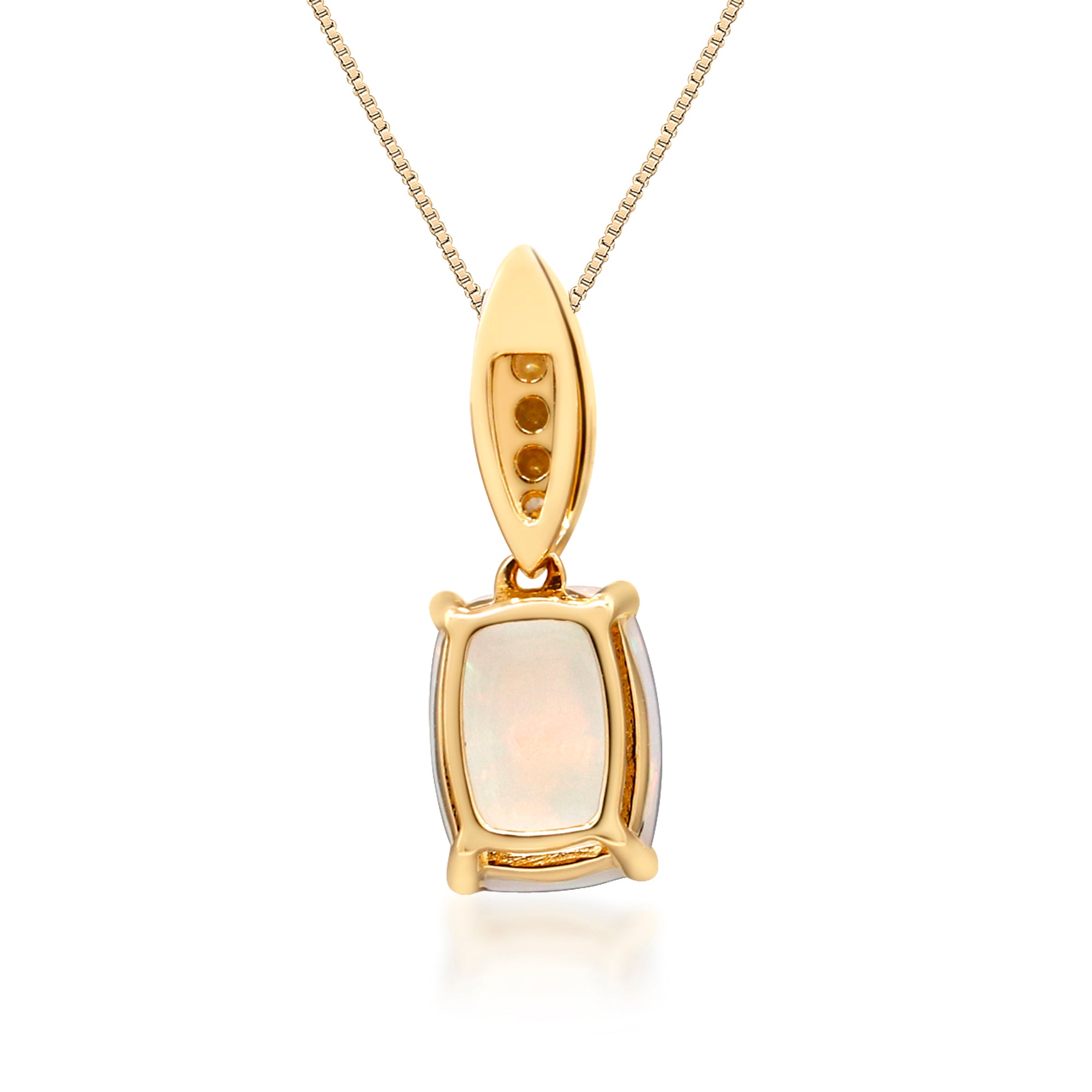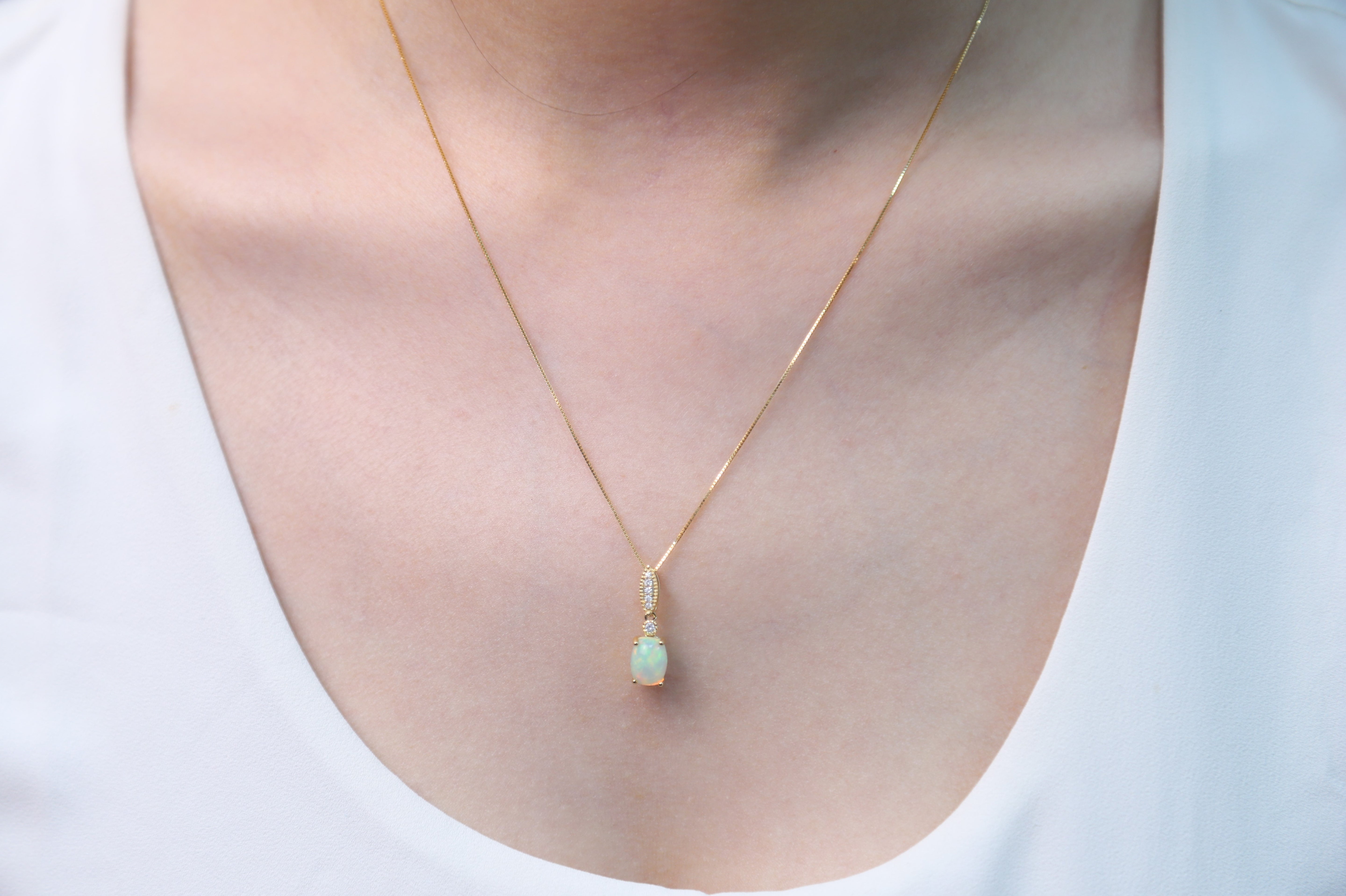 Decorate yourself in elegance with this Pendant is crafted from 14-karat Yellow Gold by Gin & Grace Pendant. This Pendant is made up of 8x6 mm Oval-Cut Prong setting African Opal (1 Pcs) 0.95 Carat and Round-Cut Prong setting White Diamond (6 Pcs) 0.05 Carat. This Pendant is weight 0.75 grams. The gorgeous Pendant hangs from a 18-inch wheat chain. This delicate Pendant is polished to a high finish shine.