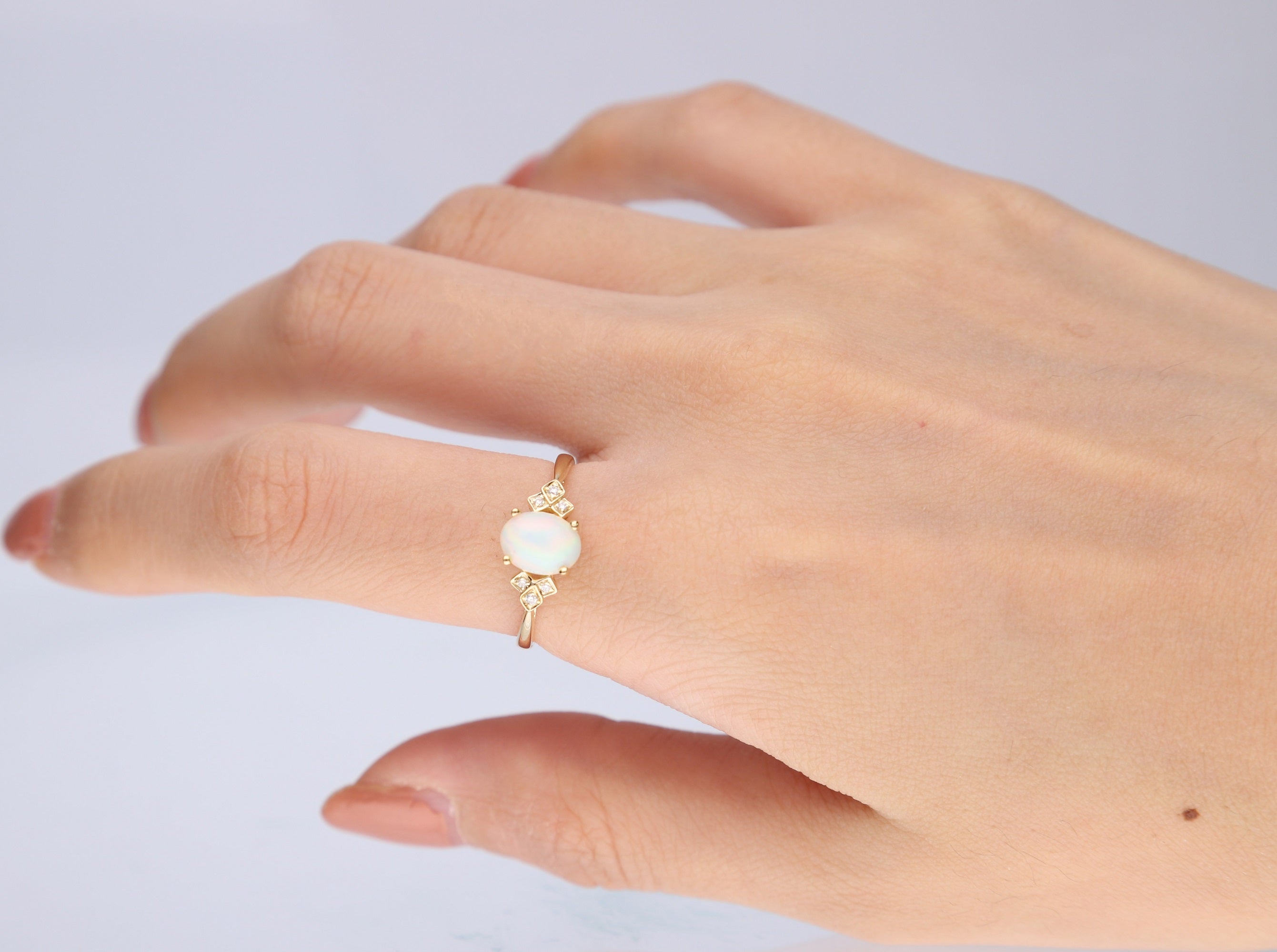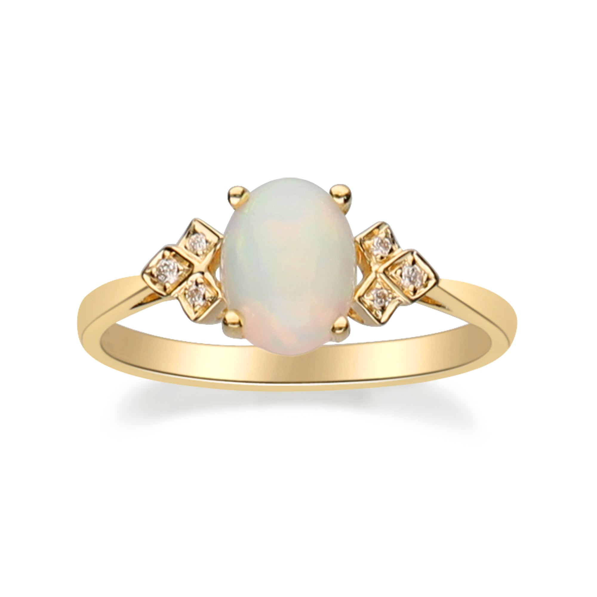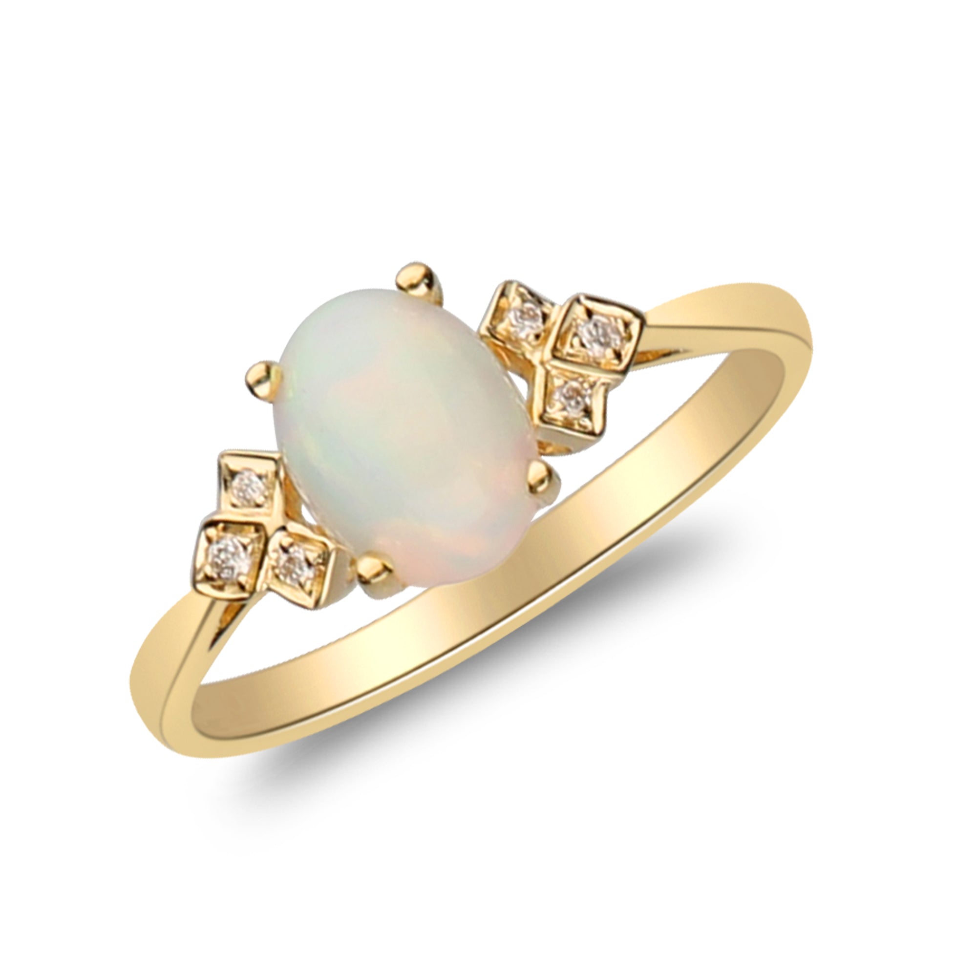 Stunning, timeless and classy eternity Unique ring. Decorate yourself in luxury with this Gin & Grace ring. This ring is made up of 8x6 MM Oval-cut Prong Setting African Opal (1 pcs) 0.86 Carat and Round-Cut Prong Setting Diamond (6 pcs) 0.03 Carat accent stones for a lovely design. This ring is weight 2.09 grams. The ring is crafted of shining 14-karat Yellow Gold and is completed by a highly polished finish.Â